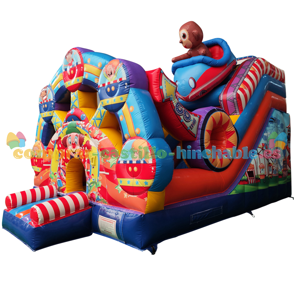 Nuestro tobogán hinchable es perfecto para los pequeños aficionados al parque de atracciones. El castillo hinchable ofrece a los niños diversión emocionante para saltar y deslizárse, mientras que el diseño del coche con el alegre monito proporciona diversión adicional. El castillo hinchable está completamente cerrado por delante y el tobogán está cubierto, lo que hace que el tobogán de parque de atracciones sea especialmente seguro.